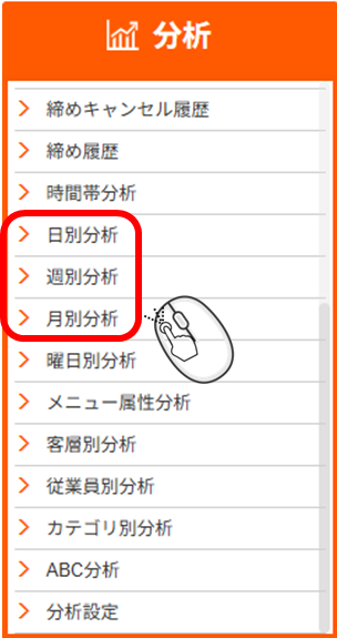 「分析」から「日別分析」「週別分析」「月別分析」のいずれかをクリックします。