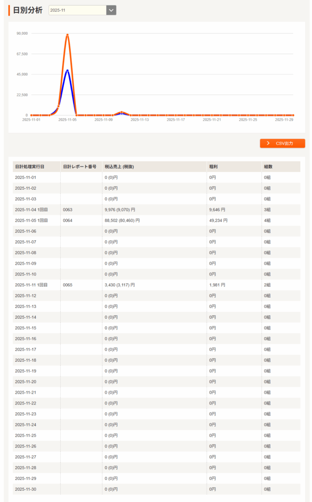 日別、週別、月別で、それぞれの「売上」「粗利」「組数」が表示されます。