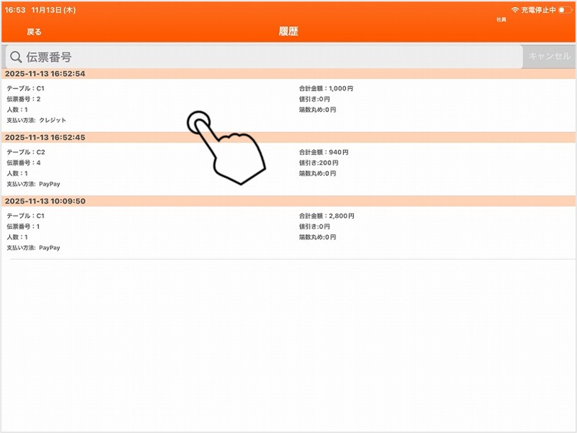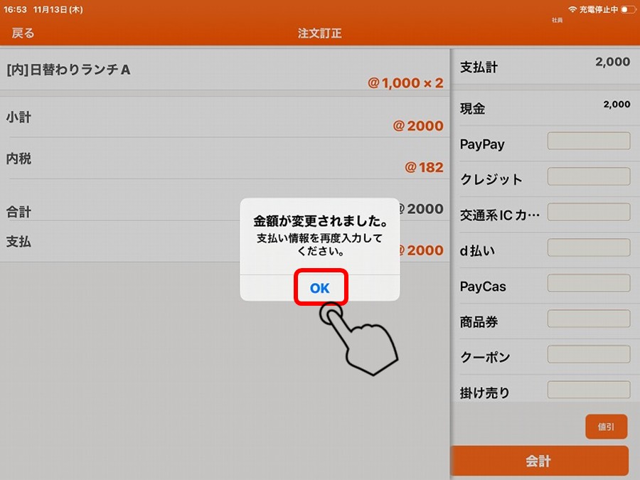 会計済みの注文内容を訂正するには、以下の手順で操作します。
