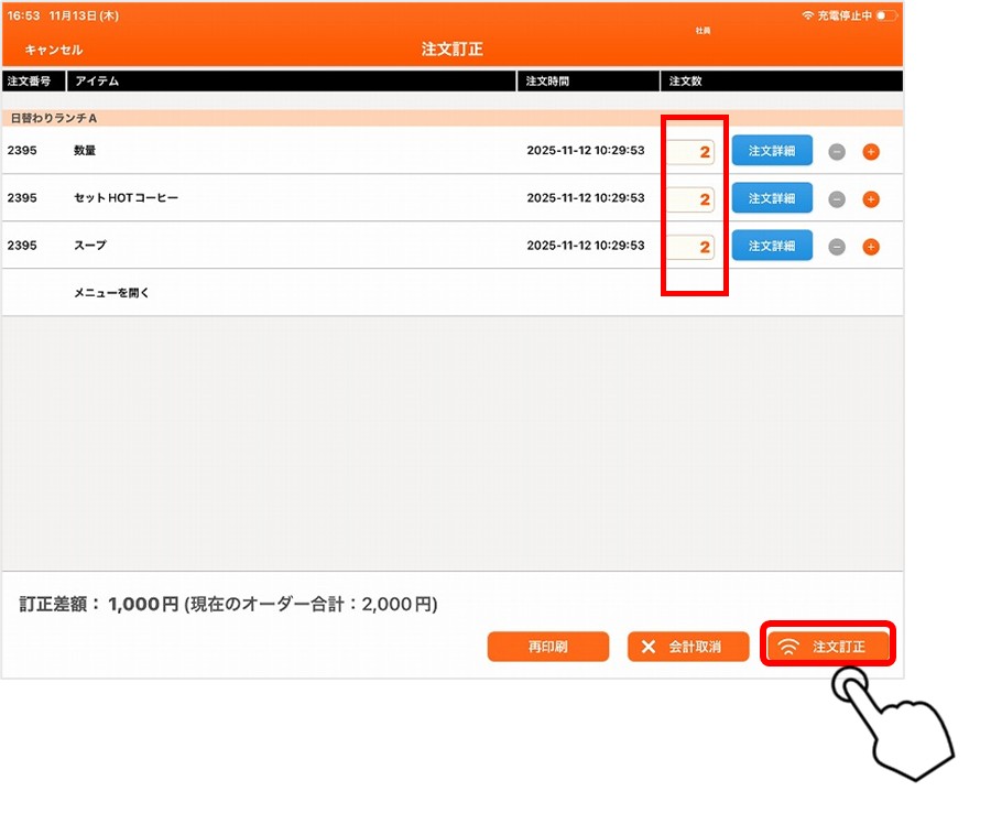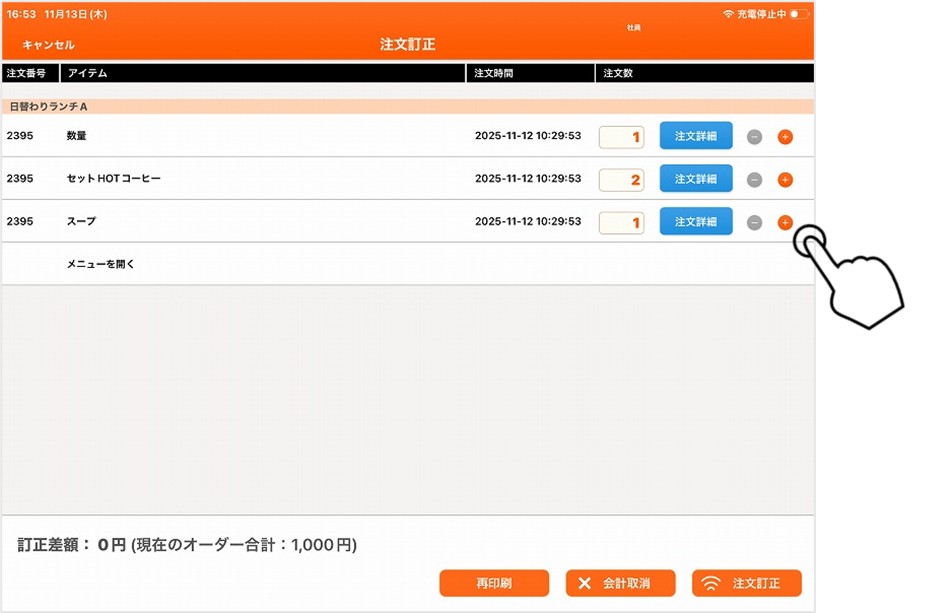 注文内容(数量)の訂正ではなく、会計済みの注文をすべて取り消すには、会計を訂正する(VOID処理)を参照ください。