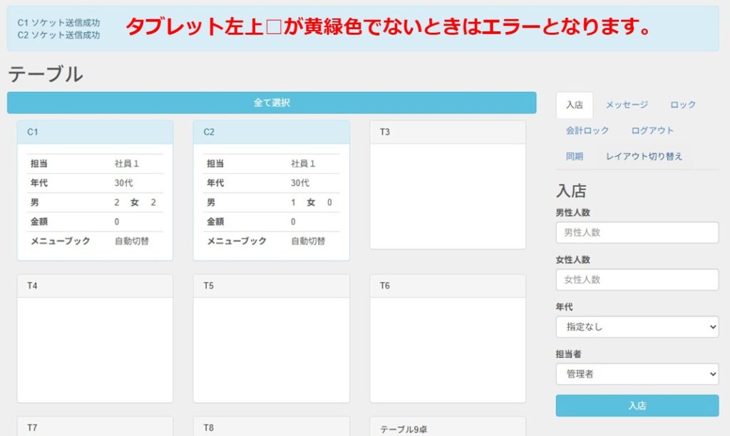 ※タブレット左上□が黄緑色でない灰色のときは、ソケットエラーが表示され成功しない場合があります。