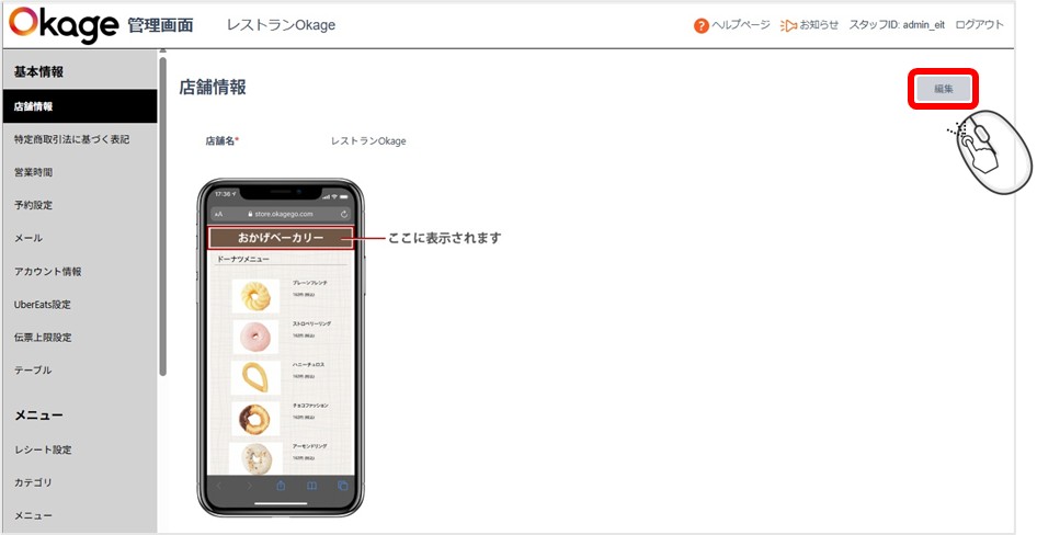 以下の手順で、モバイルオーダーの固定レイアウトメニューに表示される店舗名を変更します。
