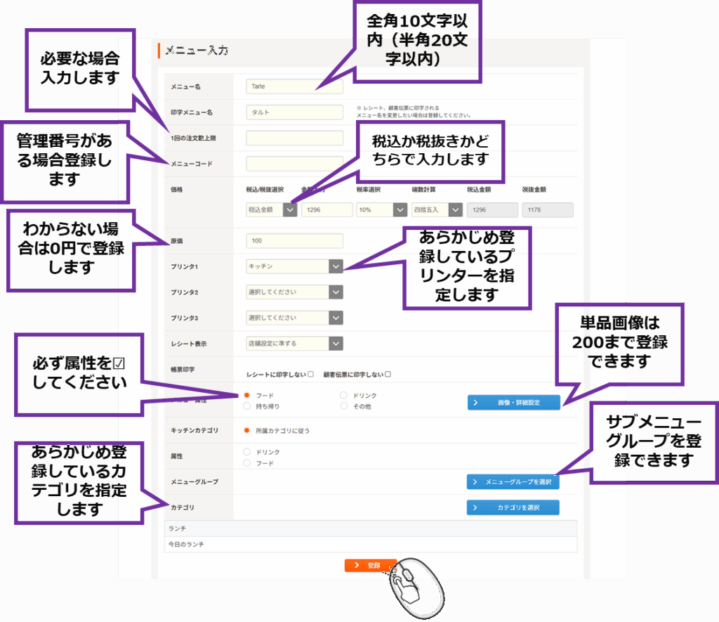 メニュー名:全角10文字以内(半角20文字以内)で登録します。