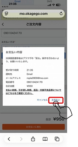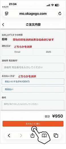 5.. 「受け取り希望時間」、Emailもしくは電話番号、お支払い方法、「備考」を選択または入力し、「お支払いに進む」をタップします。