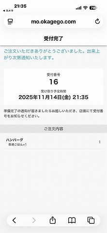 6. 注文が確定され、以下のように受付番号が発行されます。商品の準備が完了すると、お客様にメッセージが送信されます。メッセージの設定方法については、以下のページを参照してください。