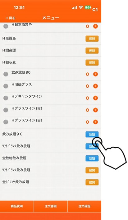 ※飲み放題カテゴリー選択して青抜きの「放題」をタップします。
