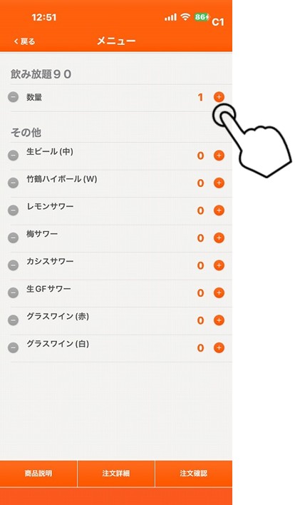 3. 次からは、上の数量は変更せず、下のメニューだけ数量を追加して注文します。