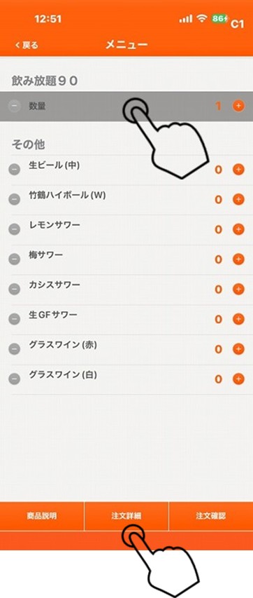 数量の行真ん中付近をタップし、「注文詳細」をタップします。