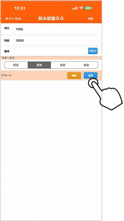 放題設定で入力した「アラート」は指定時間にジョッキアイコンがカラになるだけで分かりにくいです。