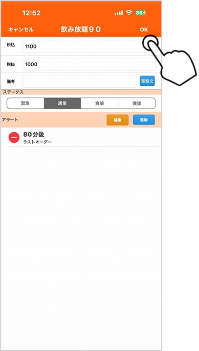 これでC1から注文した「飲み放題90」は80分経過するとビックリマークが表示されるようになります。