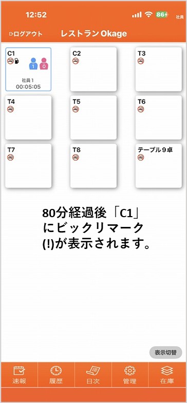 アラートで設定した時間になるとテーブルに「!」マークが表示されます。解除するにはテーブルをタップします。