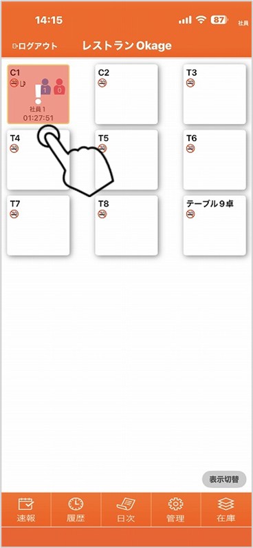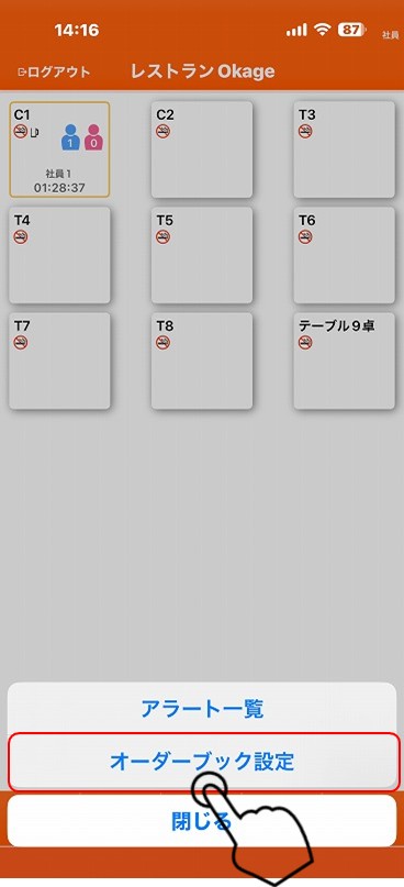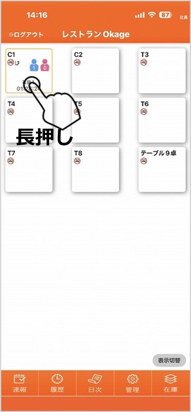 ラストオーダーをとってから、セルフオーダーのOrderbookやモバイルオーダーのOkageGo画面から注文出来なくする場合は、対象となるテーブルを長押しして設定します。