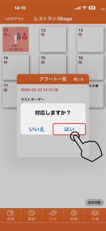 「はい」を押すと解除されます。テーブルに行ってラストオーダーを確認してきてください。