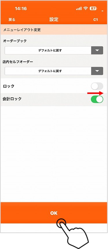 「ロック」もしくは「会計ロック」をONにしてから「OK」を押します。