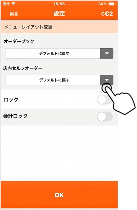 OkageGo店内版の場合、「店内セルフ」をタップした後上部に表示されるメニューレイアウト右の▽を押し、表示されるメニューレイアウトをON/OFF設定出来ます。