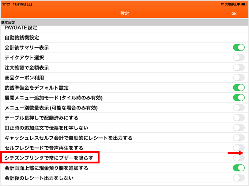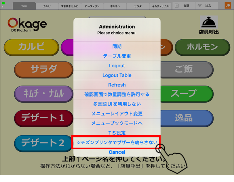 ・シチズン製プリンターでプリントコントローラー無しでご利用されている店舗様では、レジ・ハンディアプリの「管理」➡「設定」➡「シチズンプリンターで常にブザーを鳴らすをONにする必要があります。オーダーブックアプリでは、左上□を3-4回タップし、パスワードを入力して表示されるAdministration項目にある「シチズンプリンターでブザーを鳴らさない」を押して「鳴らす」にしてください。(各端末ごとに)