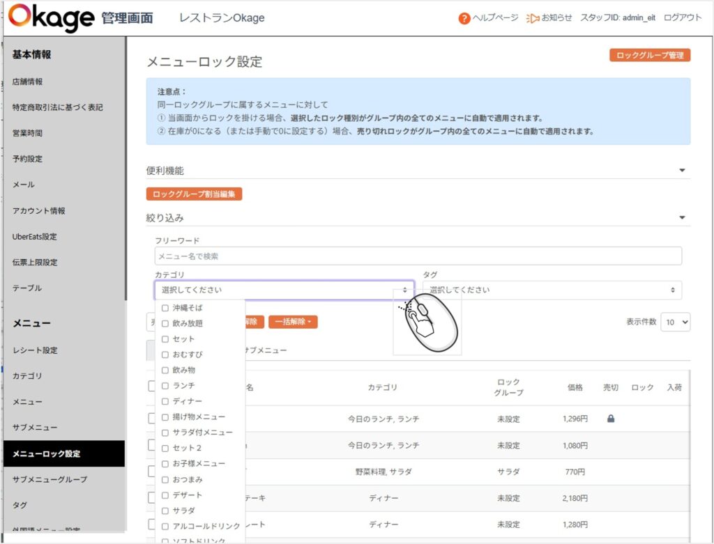 MOP管理画面左側より「メニューロック設定」を選択すると「売り切れ」、「ロック」、「入荷待ち」を複数メニュー一括で『設定』及び『解除』することが出来ます。