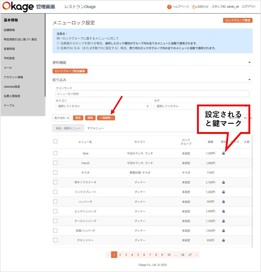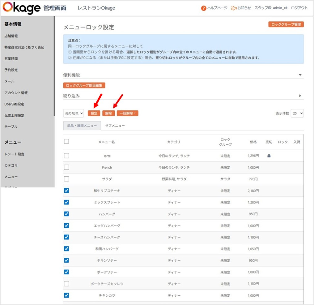 複数メニューを選択後に「一括解除」を押して、「選択メニュー全ロック解除」を押す方法もございます。↓ ↓ ↓