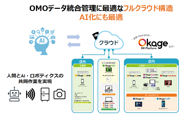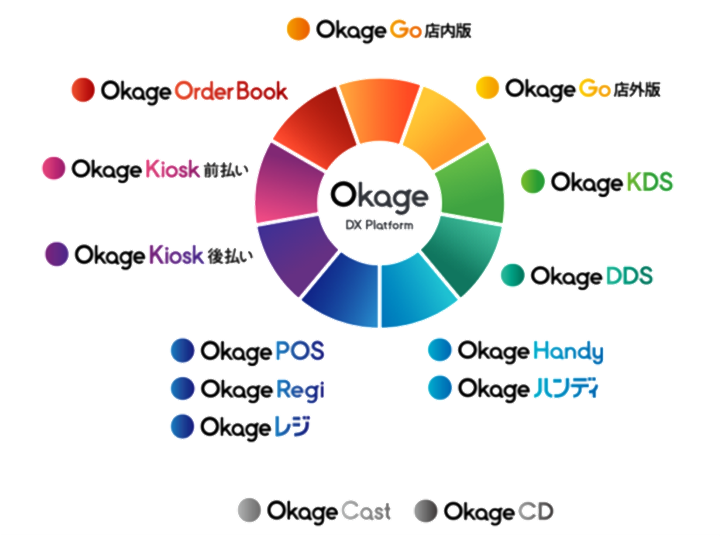 OkageDXシリーズは、POS/ハンディをはじめモバイルオーダー・セルフレジ・セルフオーダー・モバイルPOS・キッチンディスプレイ・デシャップディスプレイ・呼出しモニターなどの飲食店向けモバイルサービスをクラウドで統合管理できる次世代のフードサービスDXプラットフォームです。