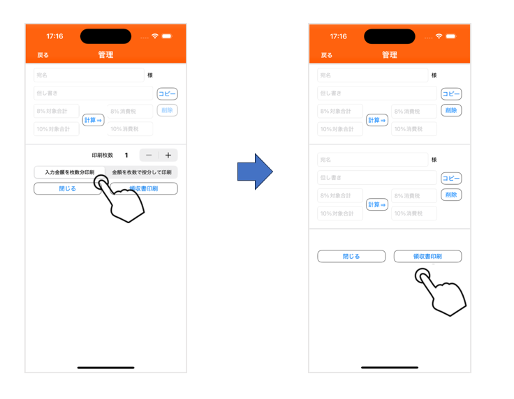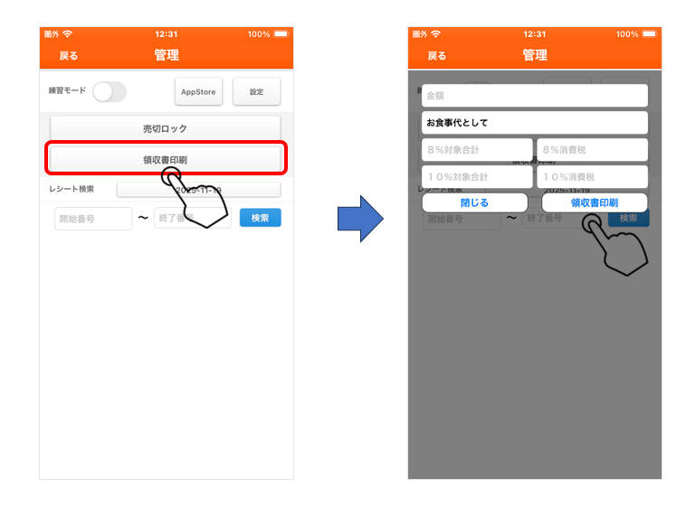2025年11月25日からレジアプリ、ハンディアプリの「管理」➡「領収書印刷」画面が変更され複数枚の領収書印字が可能となります。