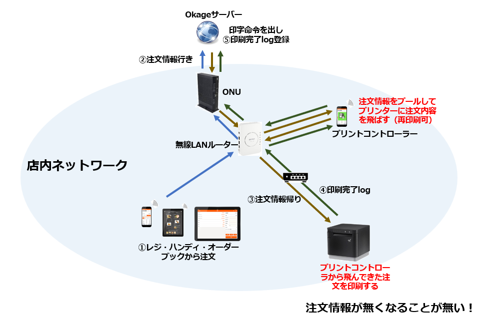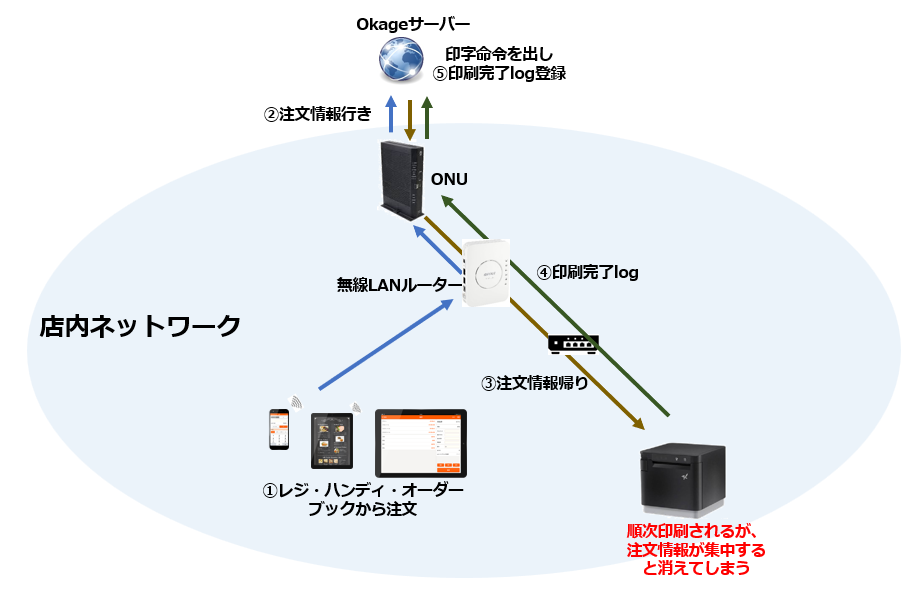 今まで「ハンディ」や「オーダーブック端末」などからの注文をキッチンプリンターに直接オーダー情報を飛ばしていましたが、繁忙時間帯に印字がされないなどのトラブルが生じていました。