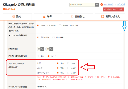 レジ管理画面にログインして、「設定」➡「店舗情報設定」を開いて「プリントコントローラー印字出力許可」を全て「する」に登録し、「保存」してください。