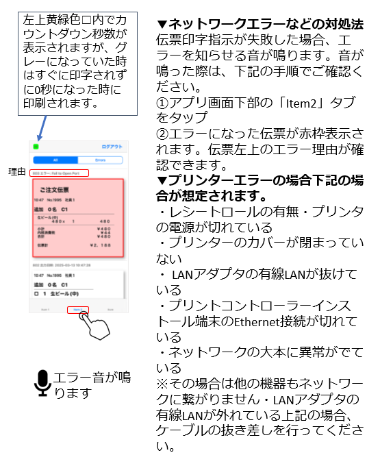 Item2は、実際に印字されるチビ券、キッチン伝票、顧客伝票が表示され、長押しして再印刷することが出来ます。エラーになると赤くなりますので再印字対応をお願いします。