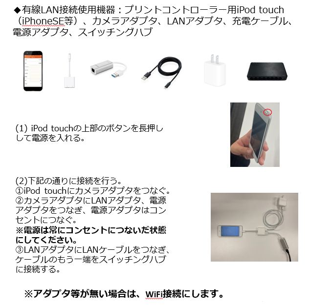 確実に注文情報をプリントコントローラーへ送るには有線LANでiOS端末(iPhoneSEなど)を店内ネットワークに接続する方法を推奨しています。(WiFi接続も可能)