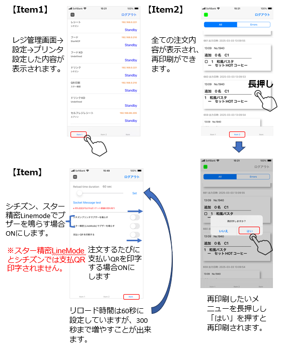 Itemは、リロード時間の調整(60秒から300秒まで)、外付けブザー音を鳴らす、一部プリンターで顧客伝票に連動して支払いQRを印字させる項目があります。