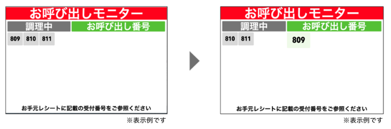 Okageレジ「レジモード」や前払いKIOSKで受付番号を使うときに、大きなモニターで出来上がり番号を表示し、受渡終了後に消すことが出来ます。