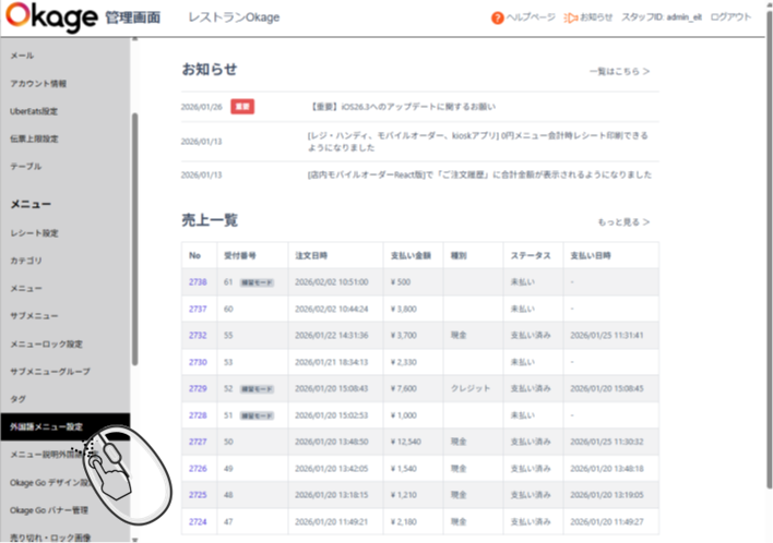 (1)Okageレジ管理画面からの登録