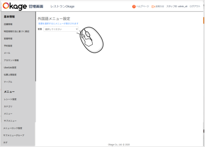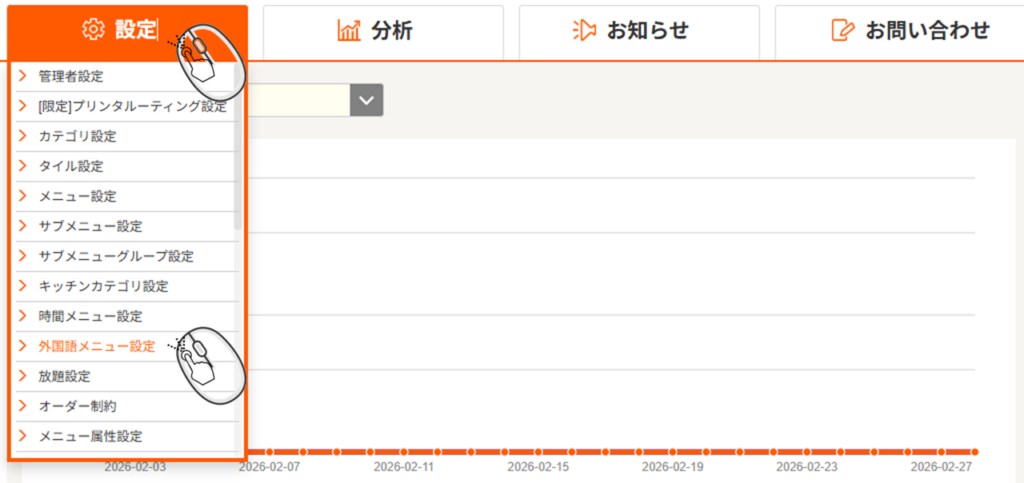 レジ管理画面にログインして「設定」→「外国語メニュー設定」を選択します。