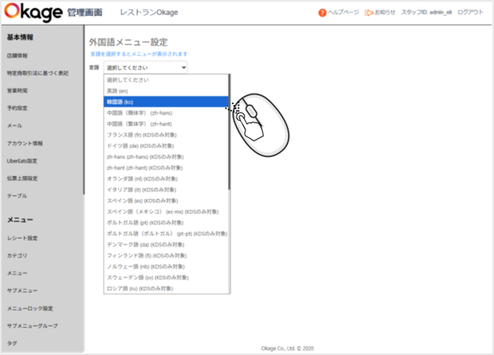 Okageレジ・ハンディ、Orderbook、OkageGo店内版、OkageGo店外版、キッチンディスプレイ、デシャップディスプレイ、前払いKIOSK、後払いKIOSKアプリに表示される「メニュー名」を外国語表示させるには、レジ管理画面から登録する必要があります。