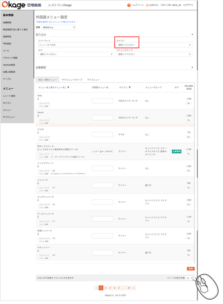 該当するメニューが10表示されますが、必要に応じて右下「1ページの表示件数」を増やします。