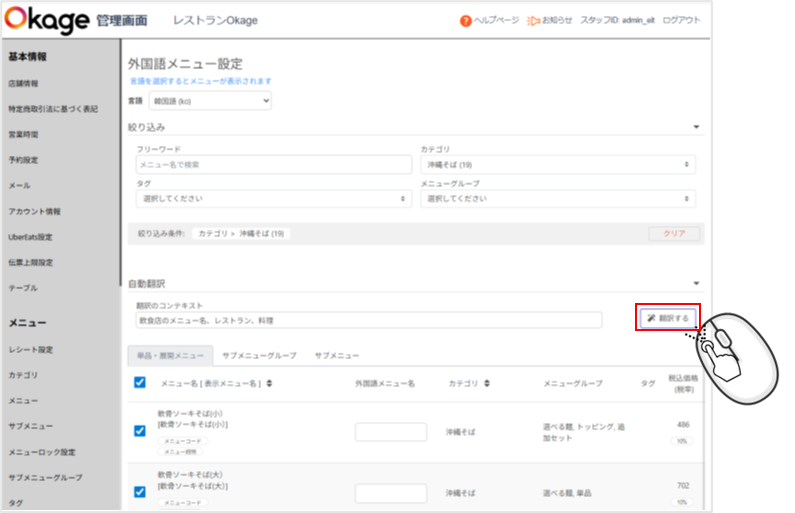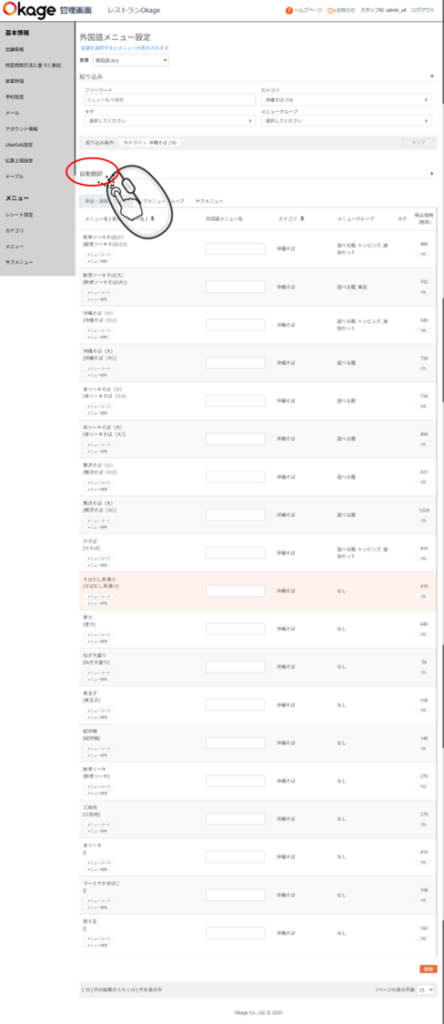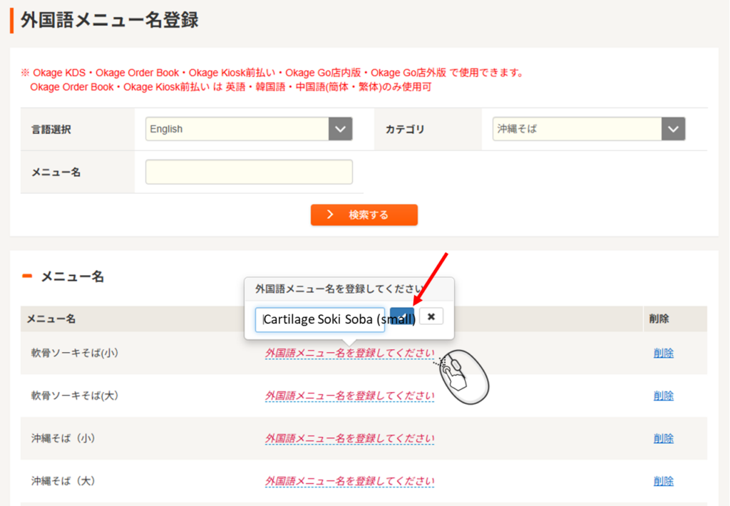 次に「沖縄そば」カテゴリのメニュー1つ1つ「外国語メニュー名を登録してください」を押して「外国語メニュー名」を枠内に入れて青枠「レ」を押して登録します。