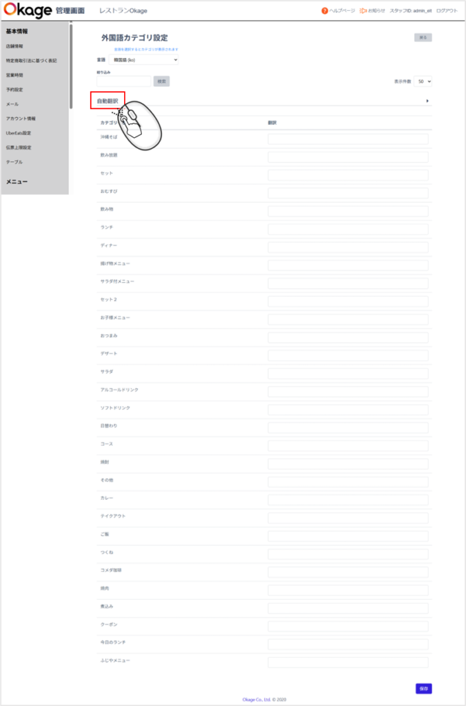上記のように1つ1つ外国語メニュー名を登録するのはとても大変な作業ですが、MOP管理画面より自動翻訳することが出来るようになりました。