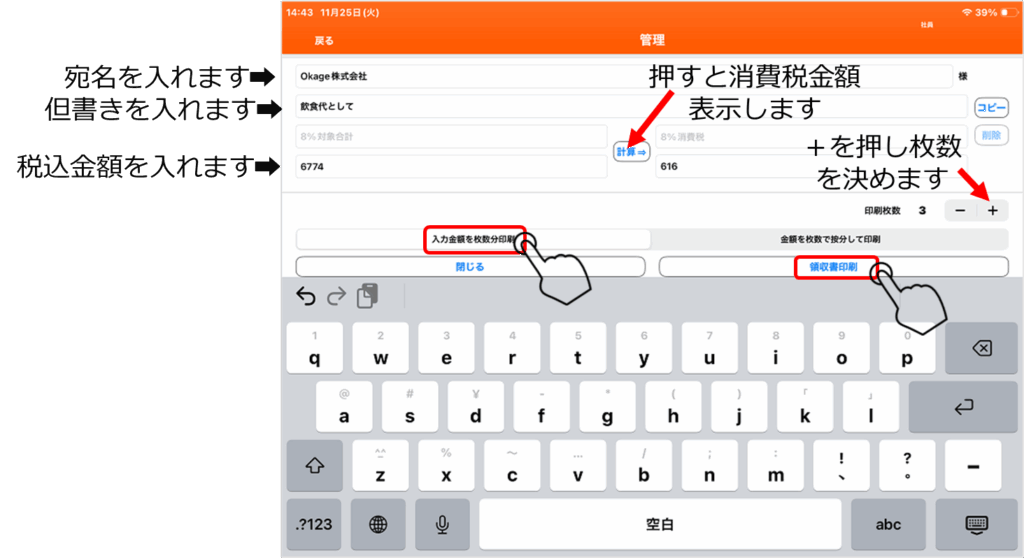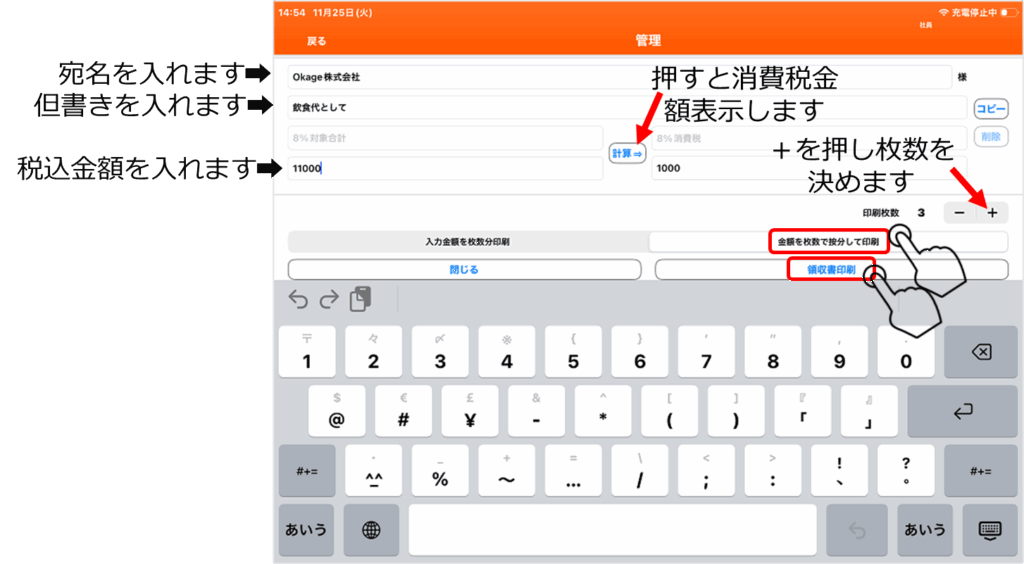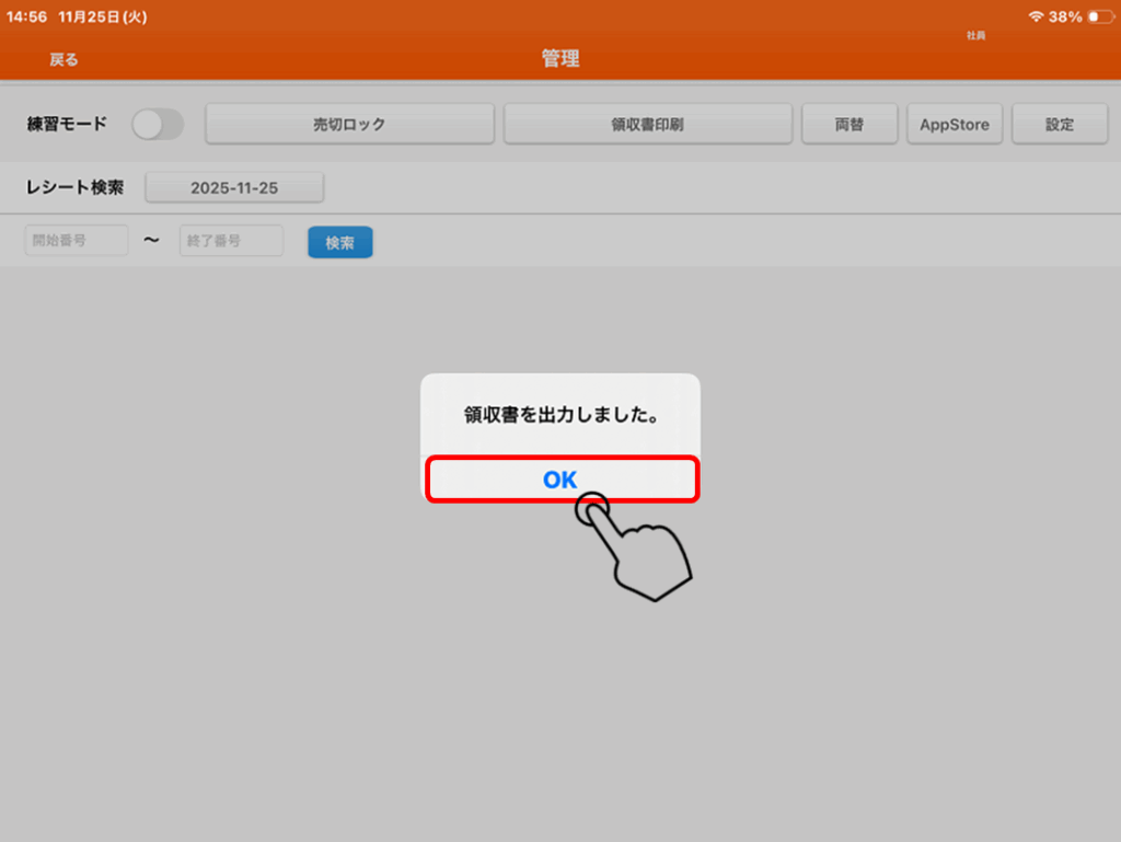 フードコートなどで卓番無しで注文を伺い前払いで処理するときは「Okageレジ」アプリで「レジモード」にしてご利用いただけます。(レシートに受付番号を印刷)