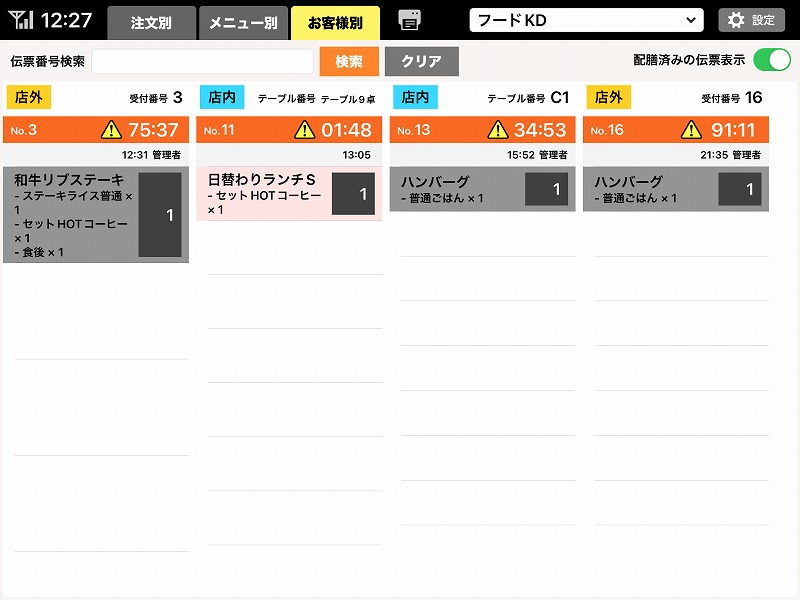 伝票をタップすると、ステータスが 「配膳済み」 になり、 「全て」 を選択すると 「調理前」 や 「調理中」 を含めたすべての伝票が表示されます。