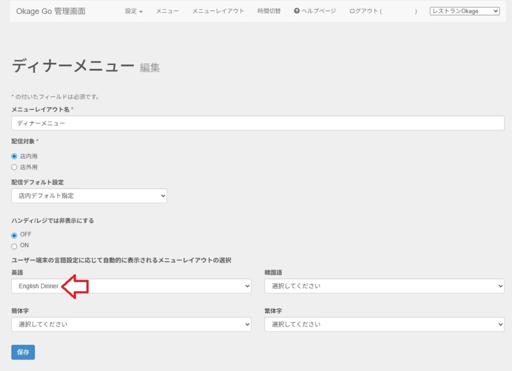 OkageGo管理画面の「メニューレイアウト」に外国語のメニューレイアウトをあらかじめ作成し、英語の時はEnglish Dinnerメニューレイアウトを表示させるよう設定したのが一番左のEnglish。
