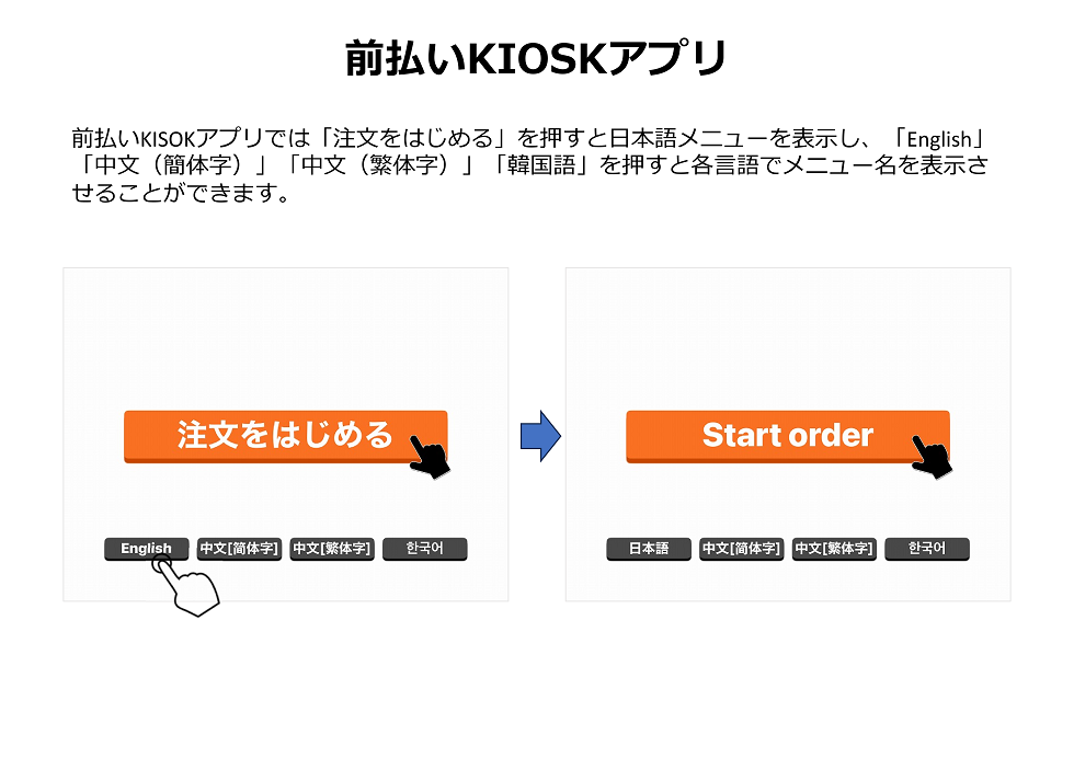 前払いKIOSKアプリで言語切替を行うには「注文をはじめる」画面の下にある言語を選択します。