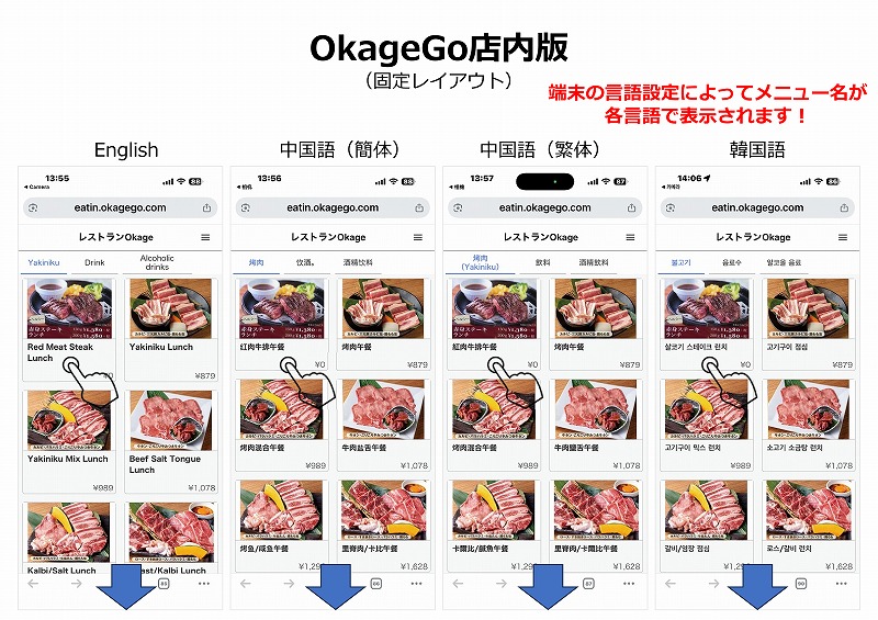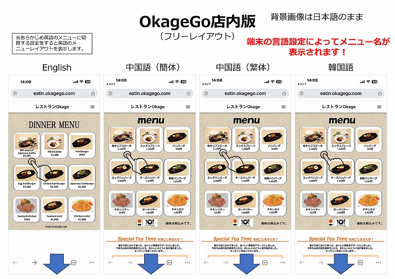 OkageGo管理画面の「メニューレイアウト」に外国語のメニューレイアウトをあらかじめ作成し、英語の時はEnglish Dinnerメニューレイアウトを表示させるよう設定したのが一番左のEnglish。