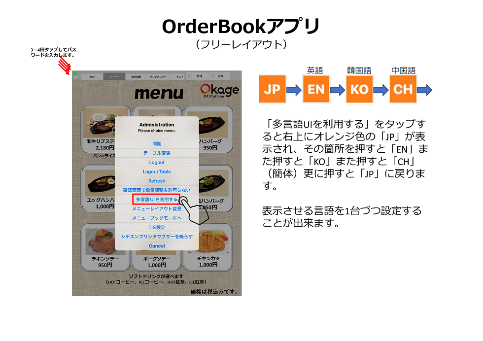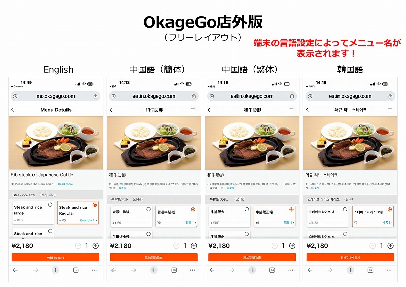 Okageレジ・ハンディ、Orderbook、OkageGo店内版、OkageGo店外版、キッチンディスプレイ、デシャップディスプレイ、前払いKIOSK、後払いKIOSKアプリに表示される「メニュー名」を外国語表示させるには、レジ管理画面から登録する必要があります。