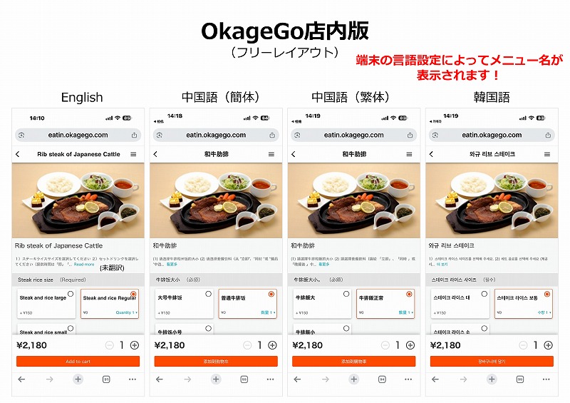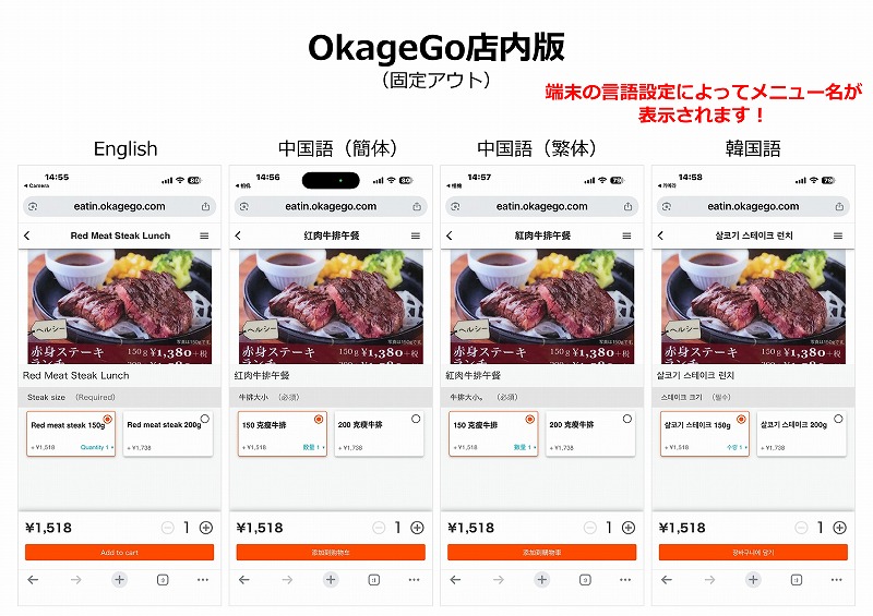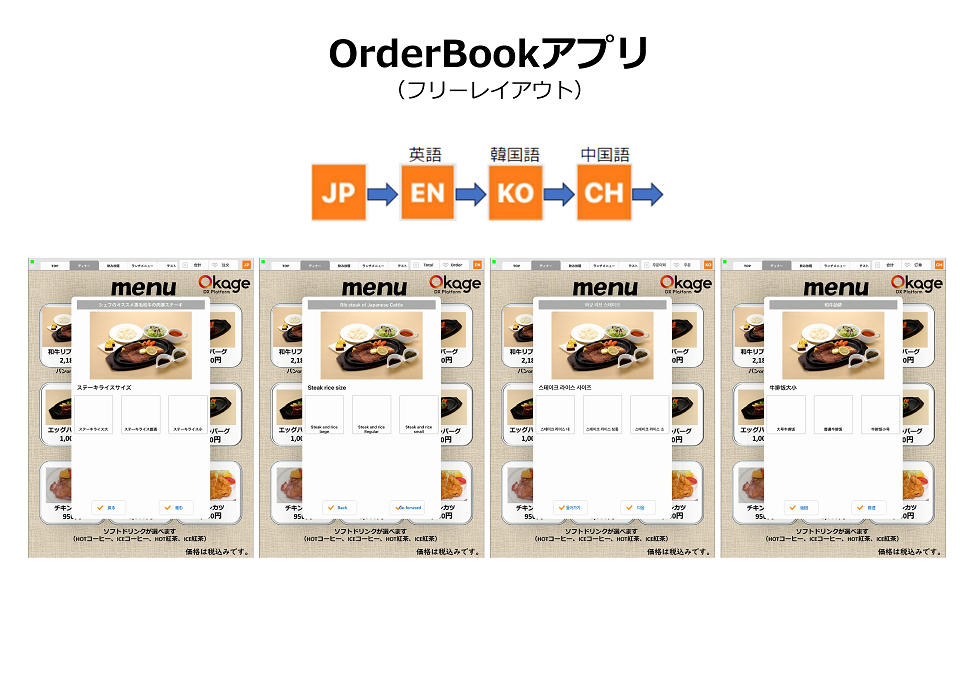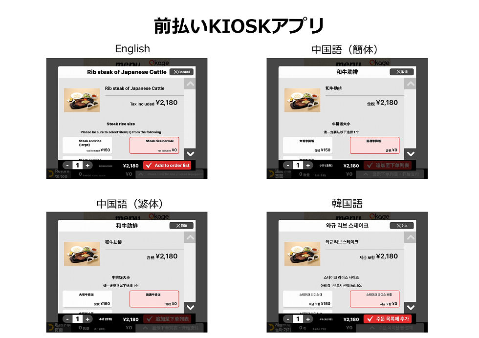 注文したメニューをEnglish、韓国語、中国語(簡体)、中国語(繁体)にしたものがこちら↓ ↓ ↓
