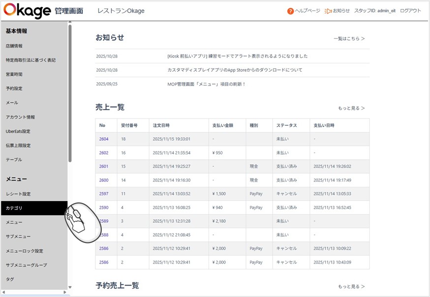 Okage管理画面とUber Eats管理画面で、一部の表記が異なります。Okage管理画面の「Uber Eatsメニュー」は、Uber Eats管理画面の「カテゴリー」に当たります。