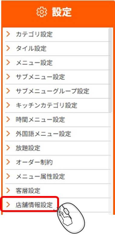 ①レジ管理画面の「設定」から「店舗情報設定」をクリックします