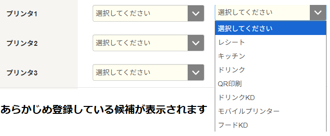 ※注文が入ると、指定したプリンタから伝票が印刷されます。複数のプリンタから出力したい場合は、「プリンタ2」「プリンタ3」も設定してください。