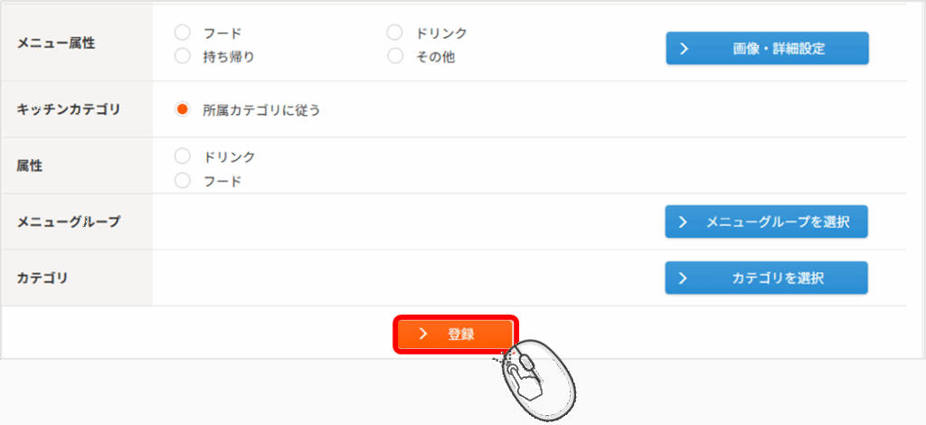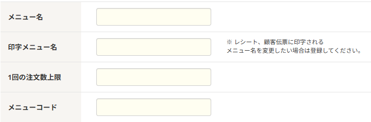 ※「1回の注文数上限」「メニューコード」は、通常空欄で構いません。(1回の注文数上限はメニューごとに注文数上限を設けられる設定です。メニューコードは基幹システムとの連動などの際に単品管理が必要な際は設定してください。設定せずにご利用いただくこともできます。)