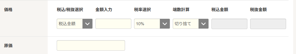 4. 「価格」の「税込/税抜選択」「金額入力」「税率選択」「端数計算」を選択または入力します。