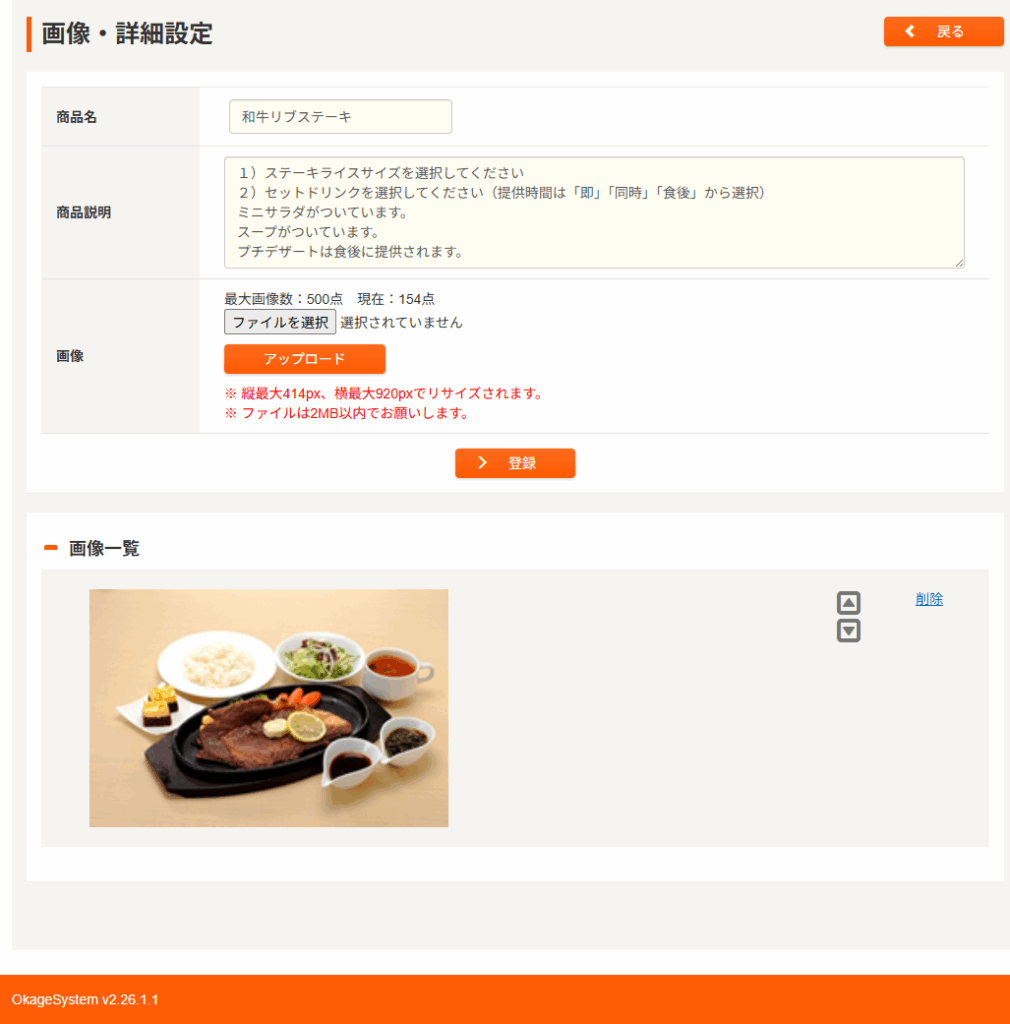 メニューに画像を登録する場合には、登録した商品の「編集」ボタンをクリックし、「画像・詳細設定」から画像のアップロードを実施ください。
